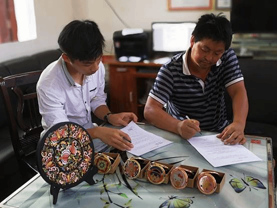 7月16日下午“景逸堂”项目团队与大红村第一书记符家义,书记王先群,乡驻村干部贾高丹进行对接洽谈,充分了解当地农村经济发展需求、留守劳动力情况、贫困人口数量,将传统手工艺的传承与精准扶贫工作相结合服务大红村,并与大红村村委签订合作协议。