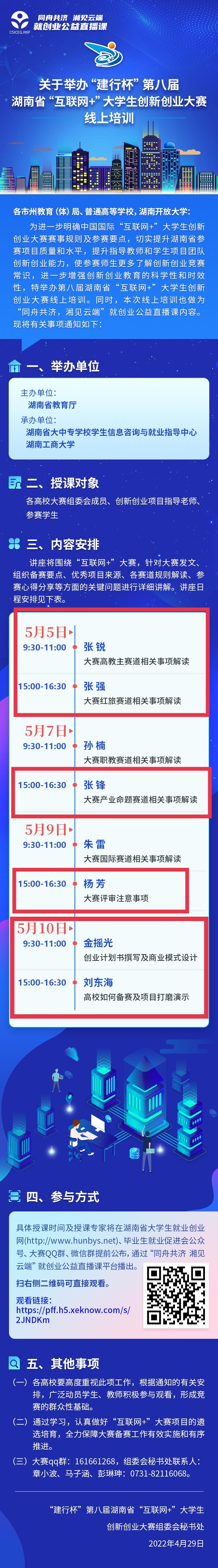 为进一步推动“互联网+”大赛进程,深化广大师生对“互联网+”大赛的认识,充分挖掘潜在项目,湖南省教育厅将于5月5日--5月10日组织第八届“互联网+”大学生创新创业大赛线上培训。为了提升培训效果,创新创业学院将在明志楼一楼路演厅(T1)组织师生实时收看培训。此次培训将同时在PU中发布,请参赛师生积极报名参加;与本校有关的培训安排详见图片中的标注部分,师生也可扫描图片中的二维码收看培训。