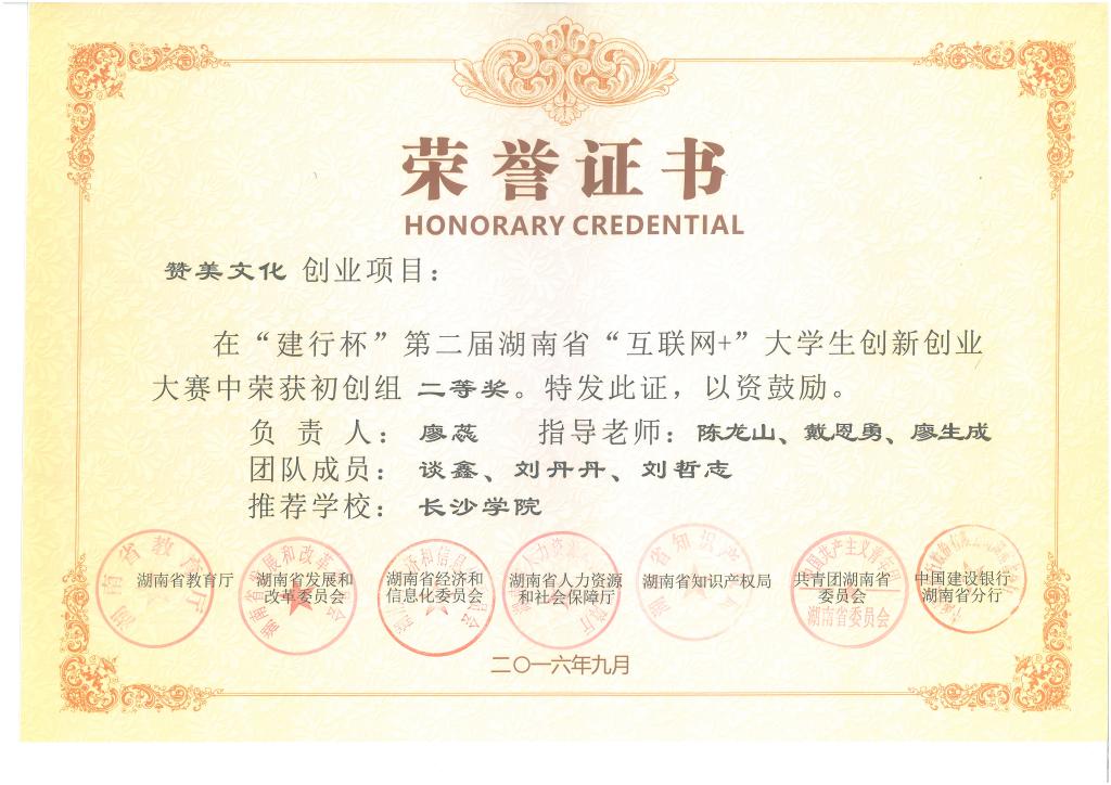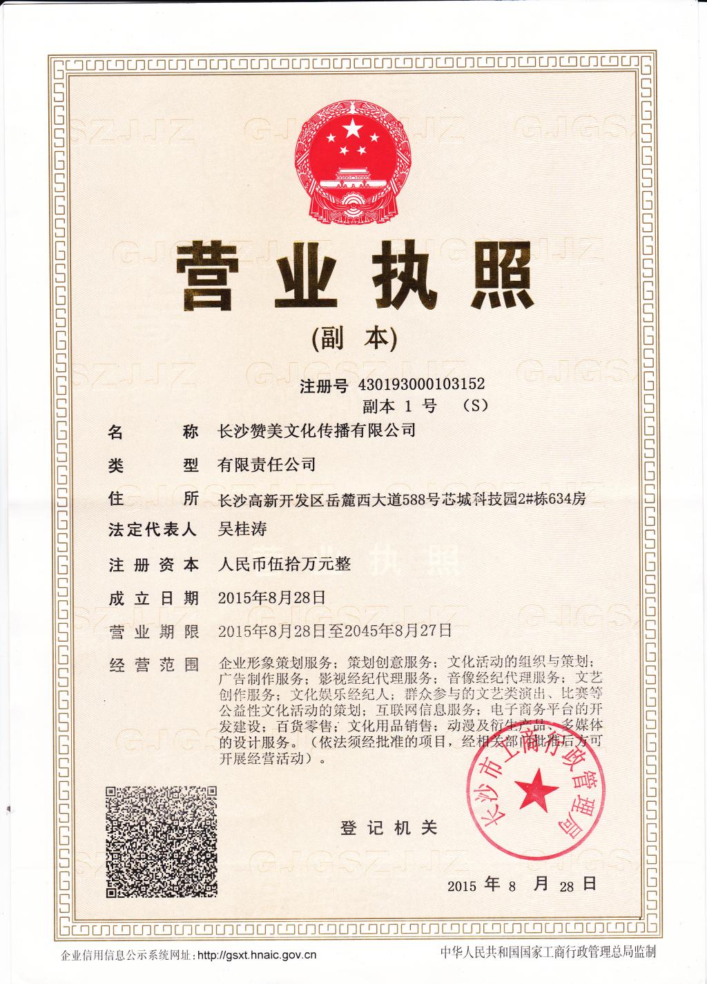 2015年8月,他们完成了公司注册,长沙赞美文化传播有限公司。他们的梦想是“让世界赞美青年”,志向远大。希望自己能成为90后青年群体的一个代表,通过自己的努力为这个世界创造出一点有价值的东西,让世界来赞美青年。从此,这个名字就将一群年轻人紧紧地绑在了一起。