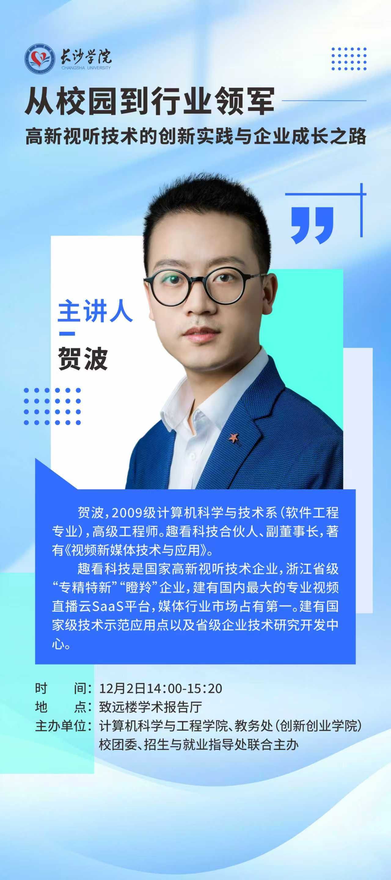 从校园走向社会,从学业转化为职业,作为大学生的我们一定还有许多迷茫,针对这一问题,为帮助学生从校园走向行业专家,了解高新视听技术的创新实践,以及企业从起步到成长,长沙学院特邀优秀校友、趣看科技合伙人兼副董事长贺波,为大家带来一场干货满满的讲座。贺波学长是我校2009级计算机科学与技术系(软件工程专业)毕业生,作为高级工程师,他不仅著有《视频新媒体技术与应用》,还带领企业成为国家高新视听技术领域的“专精特新”“瞪羚”企业,在行业内有着丰富的实战经验。