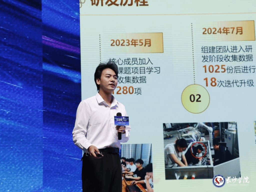 在优秀青年企业家分享环节,我校创业校友代表,长沙芒果叔叔教育科技有限公司法人、联合创始人周涛以《AI时代下的梦想突围战》为题,回顾从校园项目到年营收破千万的创业历程,强调“用情怀做教育,用技术破壁垒”的理念,鼓励学弟学妹厚植家国情怀,抓住AI+教育风口,深耕垂直领域;湖南凝英新材料科技有限公司创始人、执行董事李镓睿以《从学生到创业者的蜕变》为题,结合团队创立凝英科技、聚焦化学建材低碳技术研发的经历,剖析“产学研协同创新”的关键作用,并现场展示了校企联合实验室的最新成果,引发观众热烈讨论。